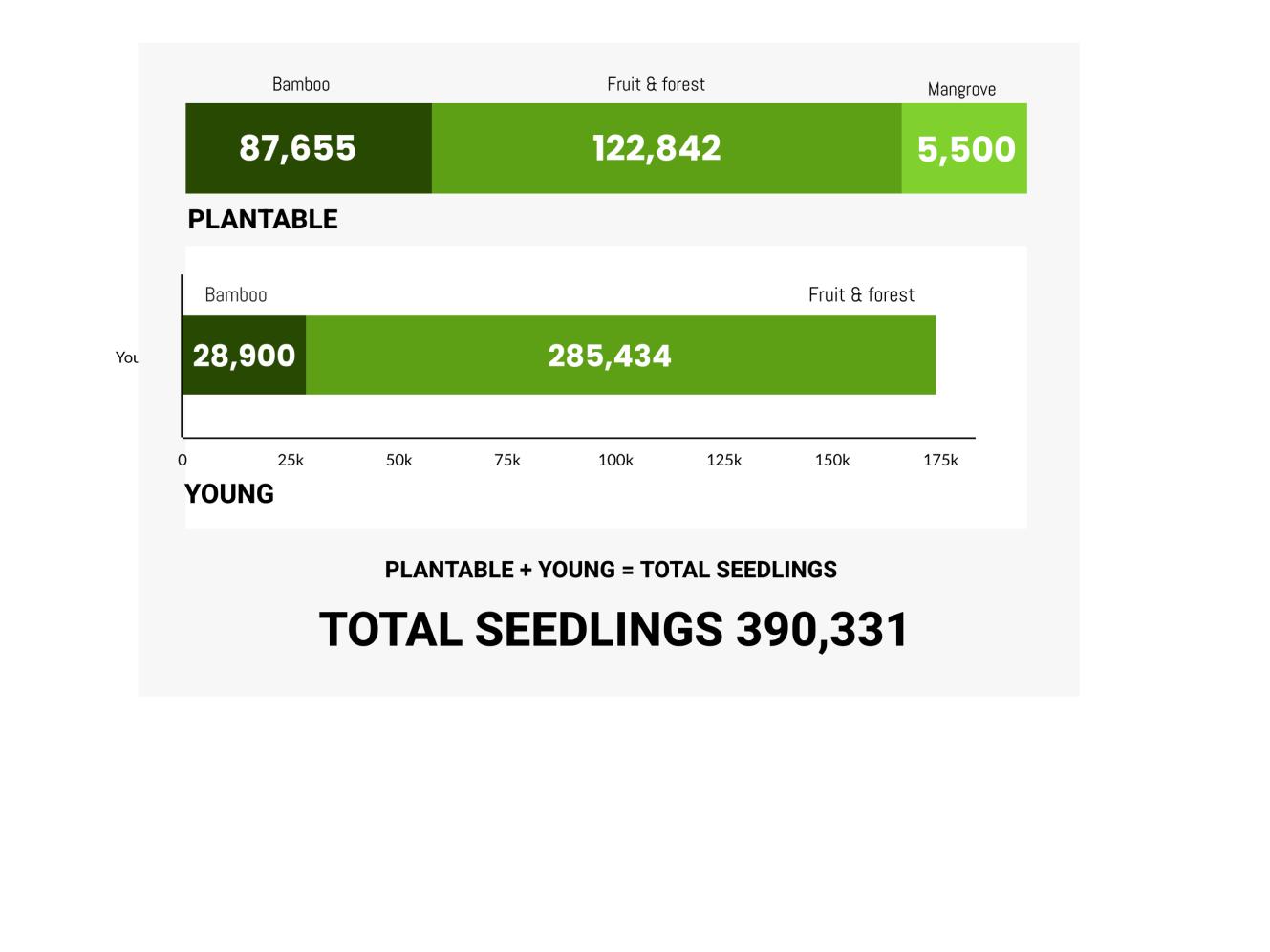 • 51,150 hills of bamboo (137% Survival Rate), 45,367 hills of F/F (151% Survival Rate)