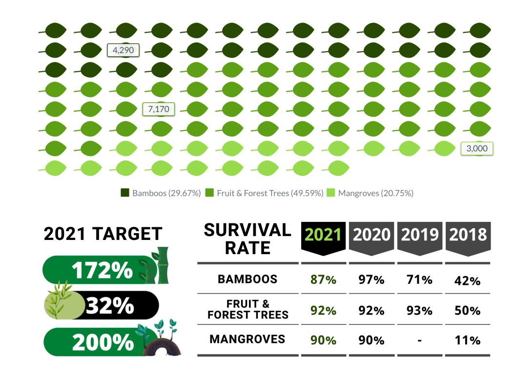 • 5,009,767 forest/fruit trees, bamboos & mangroves planted with 85% survival rate covering 10,020 ha or 2,505 linear km