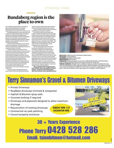 interest since the official opening in January with over 20 blocks already under contract. “Buyers for this estate have been locals from Bundaberg and along the coastline.” First-home buyers have flocked to the property market and signed up a decade-high number of new loans. New statistics released by the Australian Bureau of Statistics showed in December that the number of first-time buyers increased by 6.2 per cent in seasonally adjusted terms to a monthly total of 9606 – the highest level since December 2009. The total value of loans was $3.96 billion, and the average loan size was $412,240. The new loans taken out by first-home buyers also climbed by 21.3 per cent in December compared to December 2018. A recovering housing market, the easing of lending rules and record-low interest rates have been highlighted as the reasons for the sharp incline in first-home buyer activity. This is echoed in the rental market with the REIQ reporting vacancy rates remain steady, moving slightly by 0.1 per cent from 2.2 per cent in the September quarter, to 2.1 per cent for the December quarter. Bundaberg rental market vacancies have tightened again to 1.5 per cent up from 2.6 per cent last quarter. This specialist book is designed to give you valuable choices throughout the local market – properties that stand out for their size, location, style and added extras.