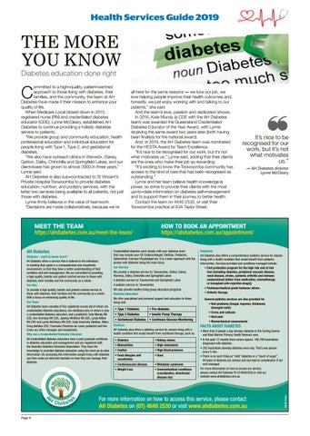 ommitted to a high–quality, patient–centred approach to those living with diabetes, their families, and the community, the team at AH Diabetes have made it their mission to enhance your quality of life. When Medicare Local closed down in 2015, registered nurse (RN) and credentialed diabetes educator (CDE), Lynne McCleary, established AH Diabetes to continue providing a holistic diabetes service to patients. “We provide group and community education, health professional education and individual education for people living with Type 1, Type 2, and gestational diabetes. “We also have outreach clinics in Warwick, Oakey, Gatton, Dalby, Chinchilla and Springfield Lakes, and our client–base has grown to almost 3000 in three years,” Lynne said. AH Diabetes is also sub–contracted to St Vincent’s Private Hospital Toowoomba to provide diabetes education, nutrition, and podiatry services, with the latter two services being available to all patients, not just those with diabetes. Lynne firmly believes in the value of teamwork. “Decisions are made collaboratively, because we’re