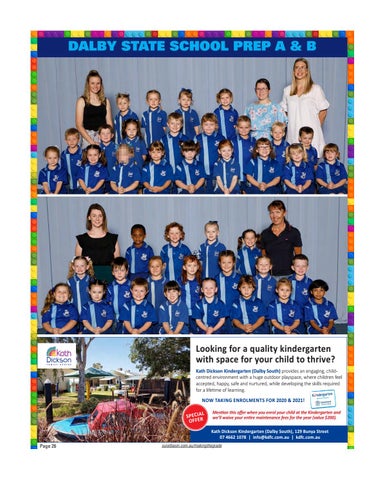 Looking for a quality kindergarten with space for your child to thrive? Kath Dickson Kindergarten (Dalby South) provides an engaging, childcentred environment with a huge outdoor playspace, where children feel accepted, happy, safe and nurtured, while developing the skills required for a lifetime of learning. NOW TAKING ENROLMENTS FOR 2020 & 2021!