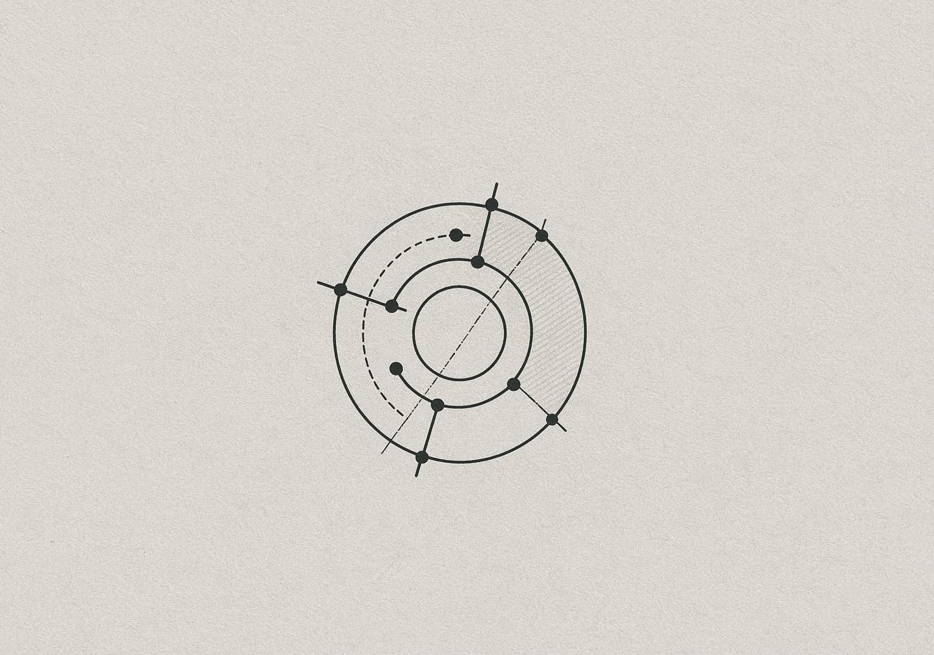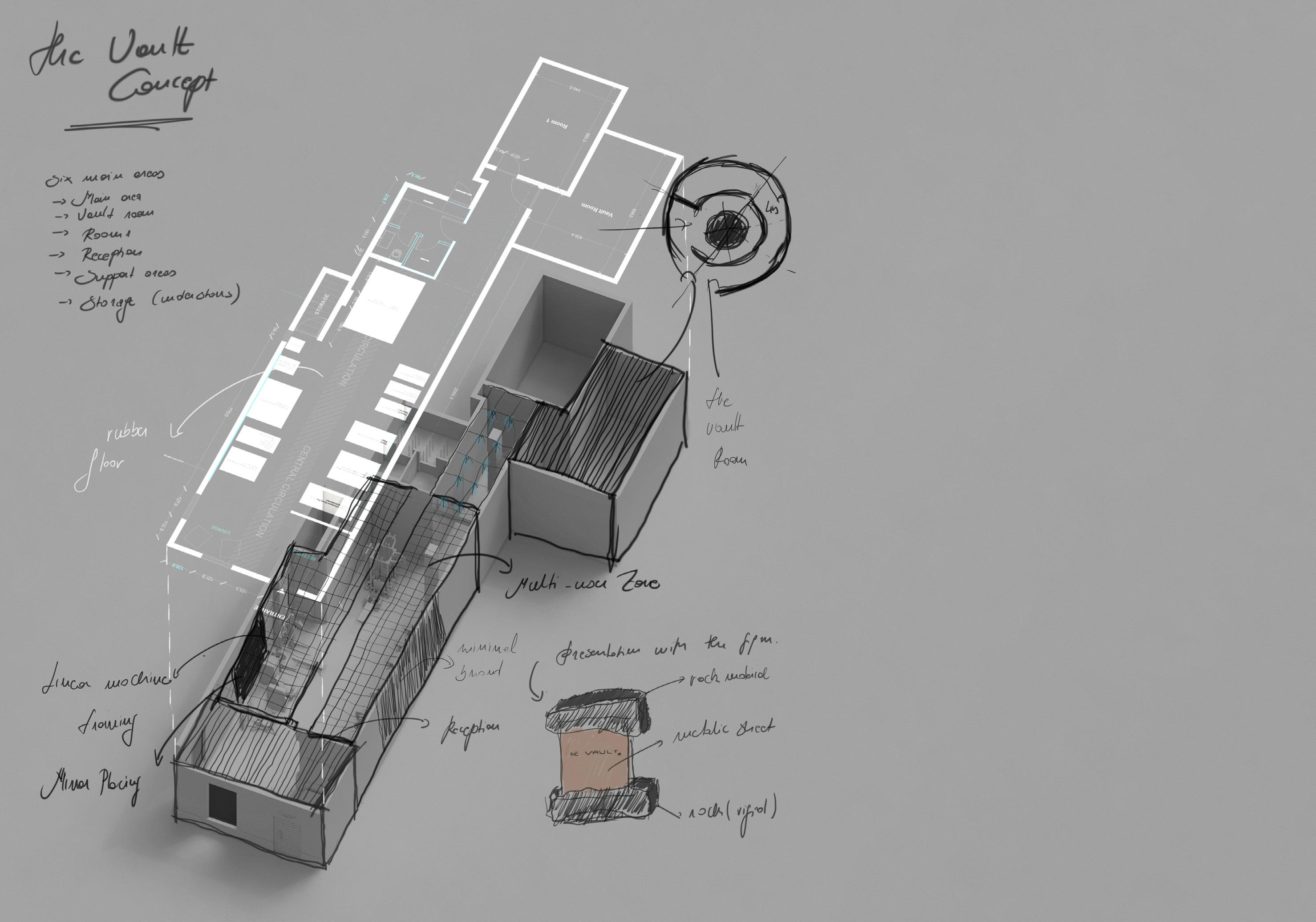 The Vault logo is built as a geometric system, with circles, anchor points, and technical lines inspired by vault mechanisms and architectural blueprints.