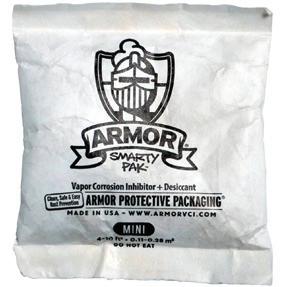 Additionally, the ARMOR SMARTY PAK™ is a super-charged, multi-tasking, rust-preventing powerhouse. SMARTY PAKs are one-part ARMOR VCI Nanotechnology™ (our “secret formula” for vapor corrosion inhibitor), which emit corrosion-inhibiting vapors to prevent rust, and one-part specialty desiccant to adsorb moisture.
