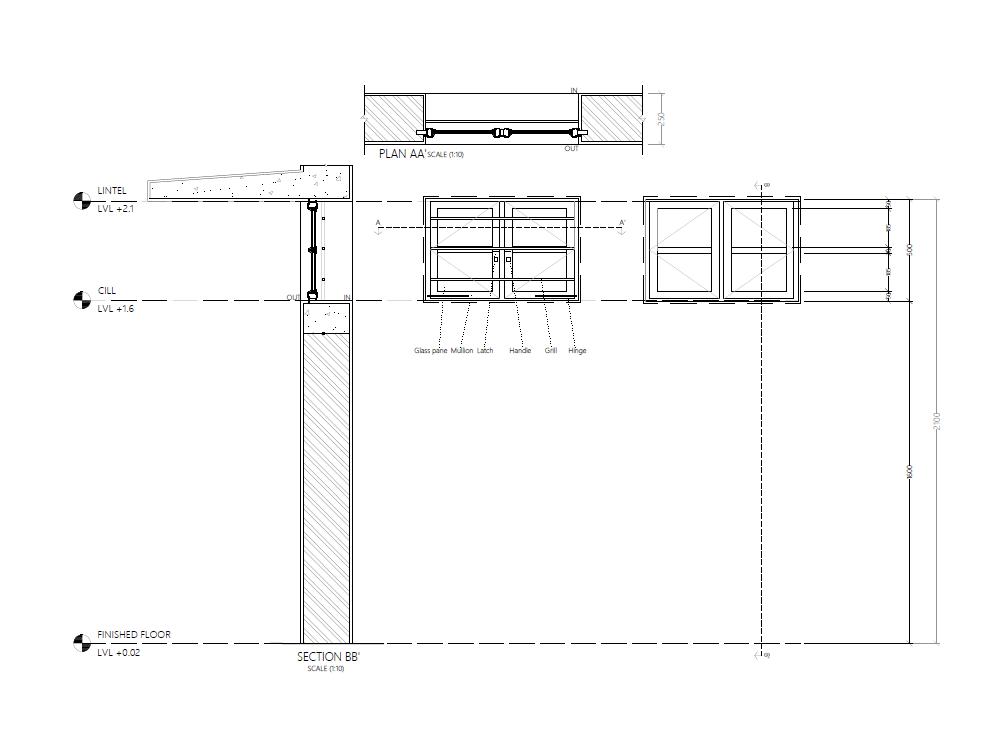 230 OUT IN PLAN AA' SCALE (1:10) FINISHED FLOOR LVL +0.02 LINTEL LVL +2.1 CILL LVL +1.1 OUT IN A A' B B' Mullion Glass pane Hinge Stile Frame Grille Rail 2400 1300 1080 438 500 500 438 50 30 50 30 38 30 50 30 50 DATE: CHECKER: AUTHOR: ACCEPTED: ISSUED: JAMS GRAPHICS ANIMATION ARCHITECTURE DESIGN STUDIO 07.5 WINDOW 1 (W1) A2 B&W MADHURYA K GREGORY A DD-MM-YYYY THE METROPOLIS A COZY NEST OF HOMES JAYALAKSHMIPURAM FINISHED FLOOR LVL +0.02 LINTEL LVL +2.1 2100 1200 750 150 150 75 75 75 150 900 150 600 150 75 OUT IN 250 250 250 OUT IN Threshold Door Handle Head Top Rail Panel Mid Rail Bottom Rail Panel Holdfast Mullion Holdfast 945 943 200 150 A A' B' B SECTION BB' PLAN AA' SCALE (1:10) SCALE (1:10) DATE: CHECKER: AUTHOR: ACCEPTED: ISSUED: JAMS GRAPHICS ANIMATION ARCHITECTURE DESIGN STUDIO 06.4 MAIN DOOR 1 (MD1) A3 B&W MADHURYA K GREGORY A DD-MM-YYYY THE METROPOLIS A COZY NEST OF FAMILY HOMES JAYALAKSHMIPURAM 46