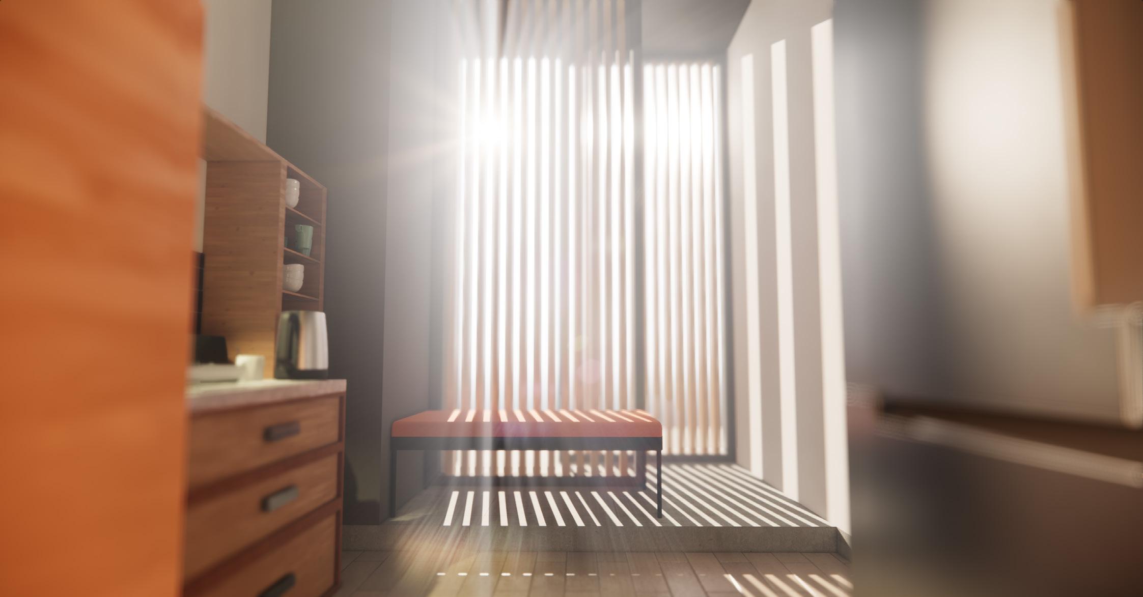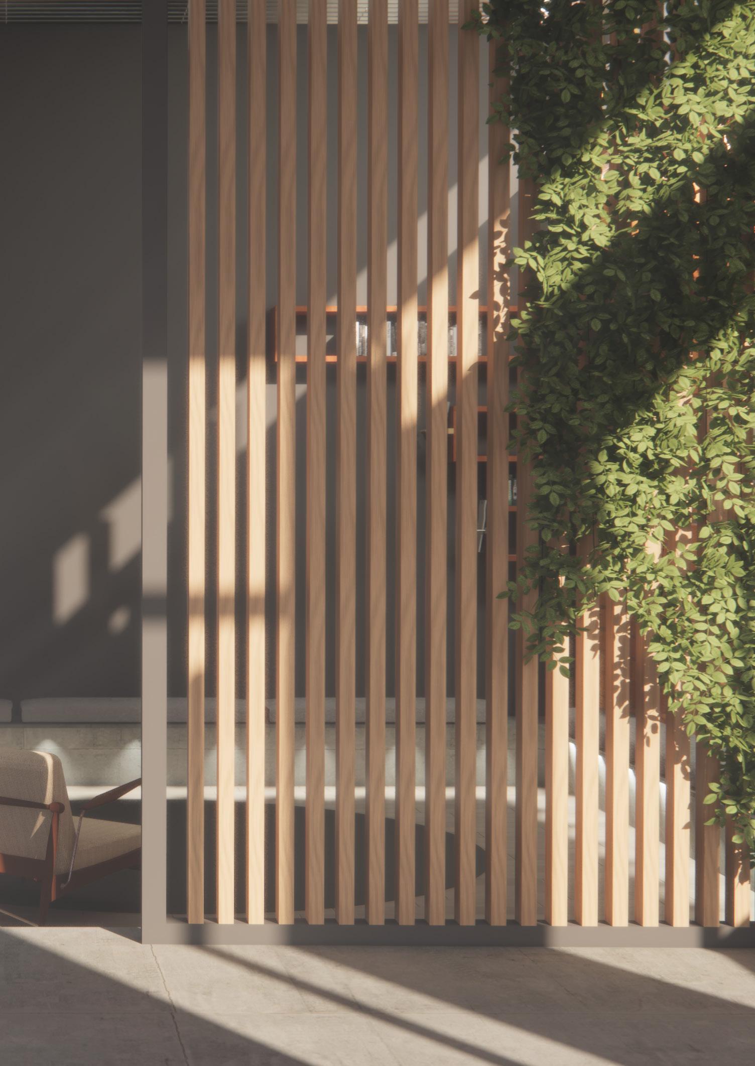 A light colour palette with a vibrant orange to make the room feel bigger. Wooden cabinetry to make it feel homely yet sophisticated. A two piece entry screen helps is distuinguishing the in from out while also letting in tons of natural light. Potted plants to bring the outside inside.
