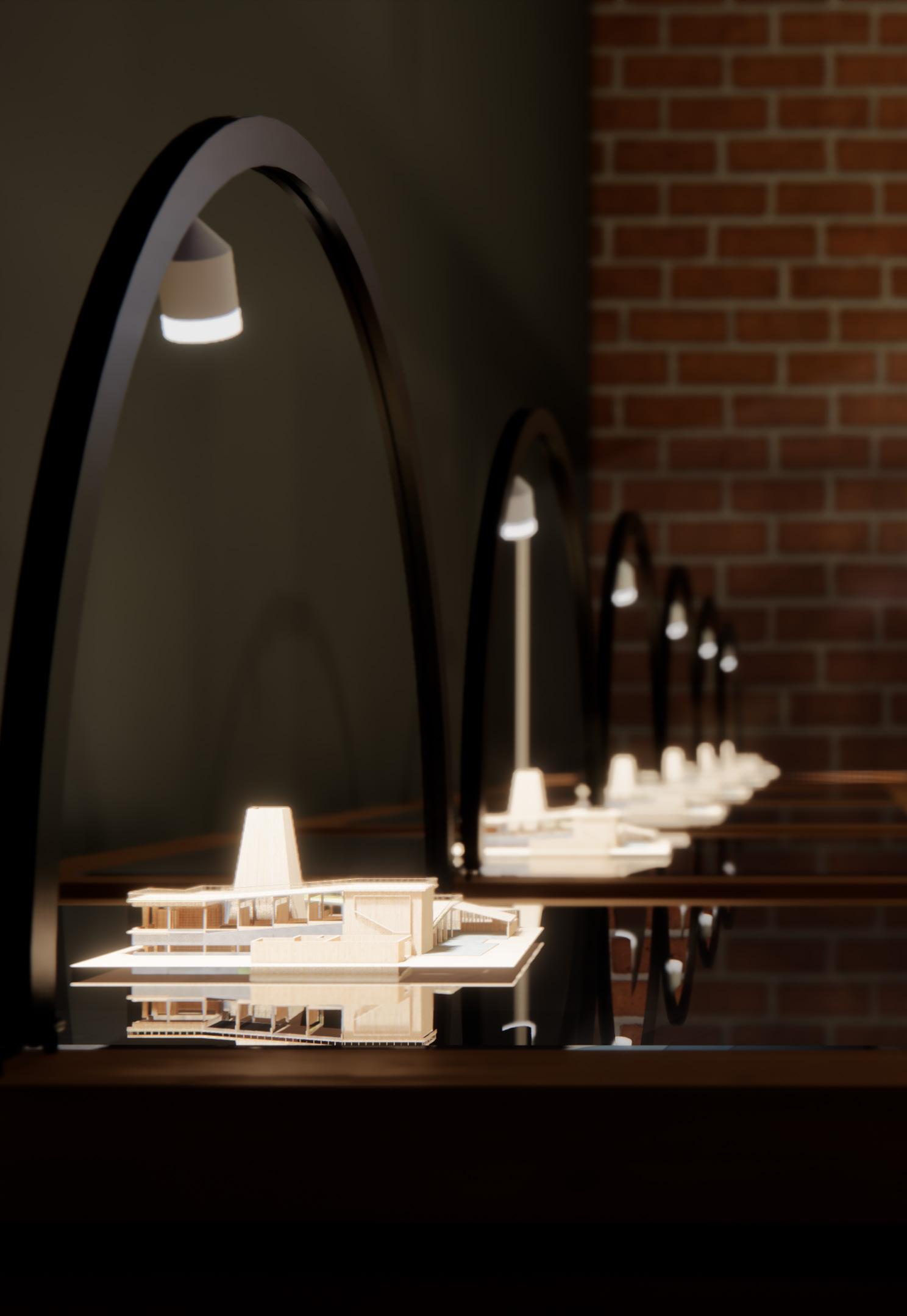 A darker more moody and sophisticated colour matching the existing college colour palette. Exposed brick roots the whole structure down to the ground while giving it a warm tone. A proposed table design for the exhibition that can replicated the sunpath using an adjustable arc.