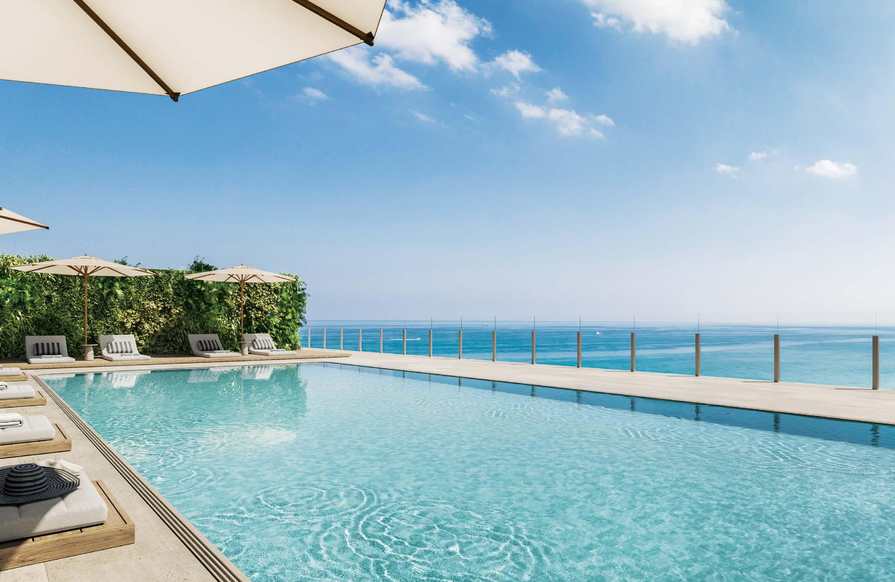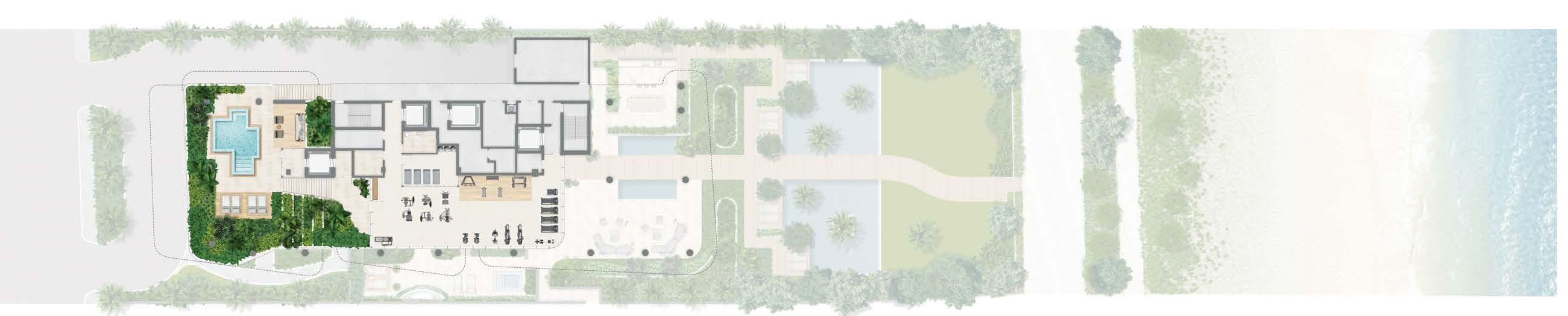 The culture of sublime service at Ocean House continues with amenities exclusive to residents, including the intimate Club Room, a summer kitchen, and an experiential spa for which residents can book or bring their own custom treatments. Beyond lie twin reflecting ponds with private floating cabanas that serve as a liminal space between the building and the ocean. On the second level, beautifully landscaped outdoor space surrounds a vitality pool and a state-of-the-art fitness studio with a private training room. On the roof, the private pool is open to every side, with sunlight from dawn to dusk, in every season. A deck with panoramic views and an event space with cocktail lounge are ideal for residents to host private gatherings.