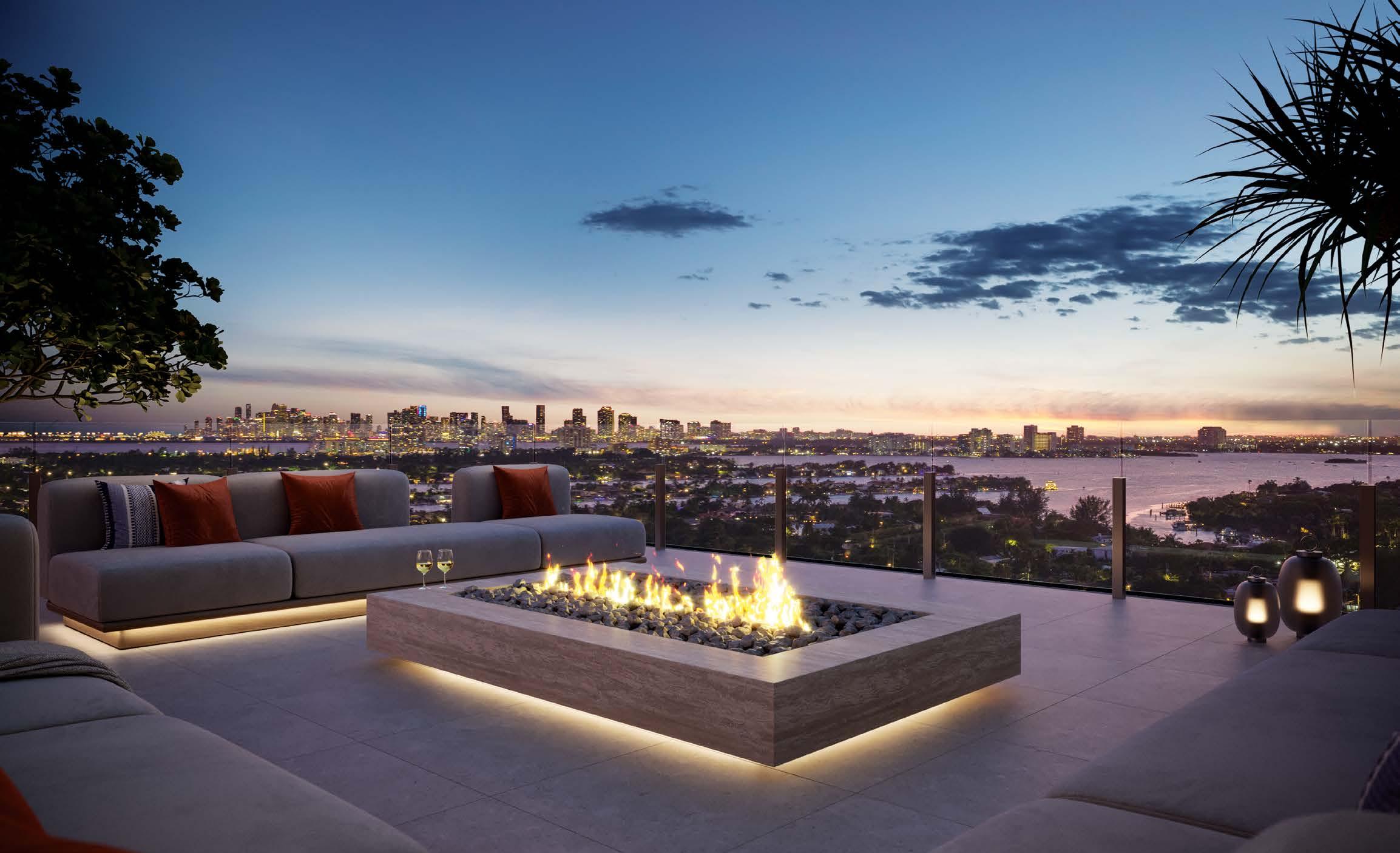 The essence of luxury: the outdoor lounge, with its panoramic views of the water and the Miami skyline, invites relaxation and reflection.