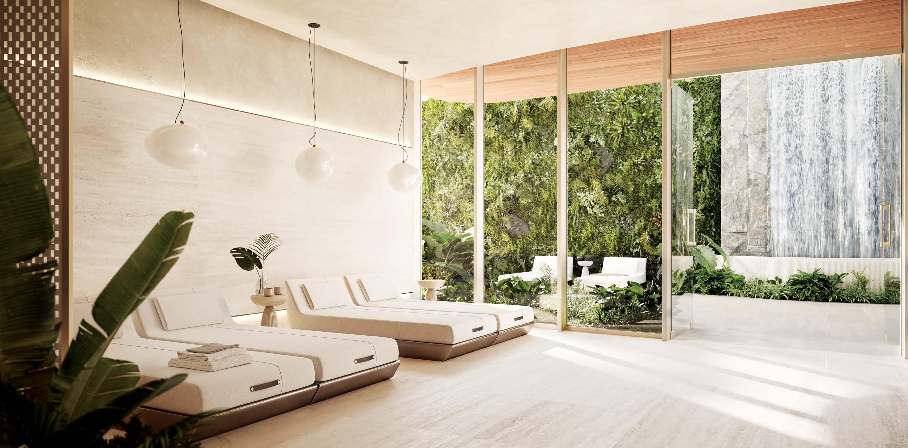 The immersive spa includes a sauna, a steam room, and private treatment and salon rooms for resident bookings, incorporating soothing vistas of water and greenery.