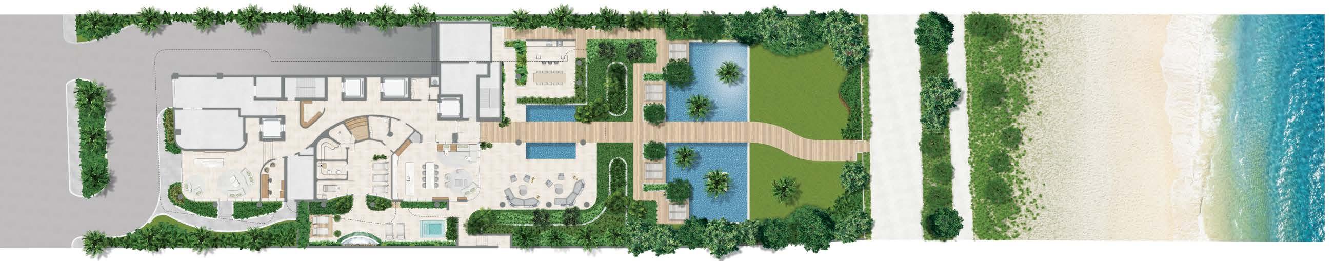 Ocean House is perfectly situated on its coveted stretch of beach. Each residence has a soaring wraparound balcony designed to optimize the ocean vistas. The balconies accentuate the curvilinear lines and flowing, essential nature of the building, which is artfully integrated into the native landscape. A walkway leads from the dunes directly to a lushly landscaped garden that opens into the double-height natural-stone outdoor lounge and the exclusive Club Room. This is barefoot living at its most luxurious.