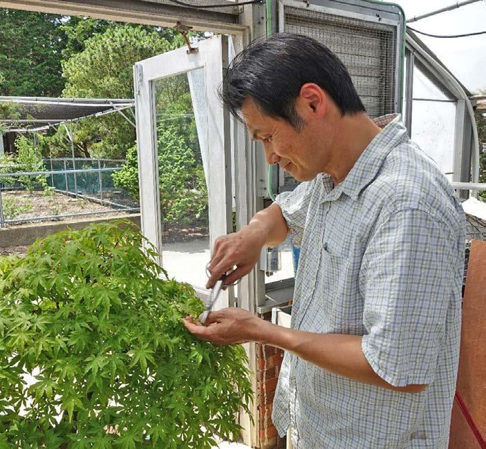 Jun Imabayashi, Arboretum bonsai specialist, works on one of the Hinoki cypresses in the collection.