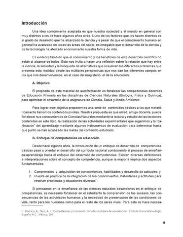 Introducción Una idea comúnmente aceptada es que nuestra sociedad y el mundo en general son muy distintos a los de hace algunos años atrás. Uuno de los factores que los hacen distintos es el grado de desarrollo que ha alcanzado la ciencia y a pesar de que el conocimiento humano en general ha avanzado en todas las áreas del saber, es innegable que el desarrollo de la ciencia y de la tecnología ha afectado enormemente nuestra forma de vida. Es evidente también que el conocimiento y los beneficios de este desarrollo científico no están al alcance de todos. Esto nos invita a hacer una reflexión sobre la relación que hay entre la ciencia, la sociedad y la búsqueda de alternativas que resuelvan los diferentes problemas que presenta esta realidad desde las múltiples perspectivas que nos dan los diferentes campos en los que nos desenvolvemos, en el caso del magisterio, el de la educación. A. Objetivo El propósito de este material de autoformación es fortalecer las compe tencias docentes de Educación Primaria en las disciplinas de Ciencias Naturales (Biología, Física y Química), para optimizar el desarrollo de la asignatura de Ciencia, Salud y Medio Ambiente. Para lograr este objetivo proponemos una serie de contenidos básicos a los que metafóricamente llamamos contenidos pivotes. Nuestra propuesta es que usted, amigo docente, pueda fortalecer sus conocimientos de Ciencias Naturales mediante la lectura y estudio de las lecciones contenidas en este libro, la realización de las actividades experimentales que sugerimos y la “calibración” del aprendizaje mediante algunos instrumentos de evaluación para determinar hasta qué punto se han alcanzado las metas del contenido estudiado. B. Enfoque de competencias en educación. Desde hace algunos años, la introducción de un enfoque de desarrollo de competencias básicas pasó a orientar el desarrollo del currículo nacional conduciendo el proceso de enseñanza-aprendizaje hacia el enfoque del desarrollo de competencias. Existen diversas definiciones e interpretaciones sobre el concepto de competencia, aunque la mayoría implica dos aspectos fundamentales: 1. Comprensión y adquisición de conocimientos, habilidades y desarrollo de actitudes; y 2. Puesta en práctica de la integración de los conocimientos, habilidades y actitudes para resolver problemas y situaciones diversas1 . Si pensamos en la enseñanza de las ciencias naturales basándonos en el enfoque de competencias, es necesario fortalecer en el estudiante la comprensión de los sucesos, las consecuencias de las actividades humanas y la necesidad de preservación de las condiciones de vida, tanto para los humanos como para el resto de los seres vivos. Para esto se hace necesa1 Barraza, A., Dipp, A. J. “Competencias y Educación: miradas múltiples de una relación”. Instituto Universitario Anglo Español A.C., México, 2011.