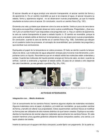 El azúcar disuelto en el agua produjo una solución transparente, el azúcar cambió de forma y de apariencia; b. Es un cambio reversible ya que si se evapora el agua, el azúcar recupera su estado, forma y apariencia original; no se observaron nuevas propiedades, ya que la mezcla resultante es dulce como el azúcar. En conclusión, ocurrió un cambio físico (Fig. 10C). Encienda una vela y pídales que observen cómo la cera se derrite. Vierta un poco de cera derretida sobre una superficie y deberán observar cómo vuelve a solidificarse. Pregúnteles: ¿Qué ocurrió ?¿Es un cambio físico? Las respuestas a las preguntas son: a. Hay un cambio de apariencia, la cera se vuelve transparente al pasar a estado líquido; b. El cambio es reversible, porque la cera vuelve al estado sólido al disminuir la temperatura y no se observaron nuevas propiedades. En conclusión, cuando la cera se derrite es un cambio físico (Fig. 10B). Solicíteles que dibujen en el cuaderno todos los procesos, el concepto de reversibilidad, que contesten las preguntas y que escriban sus conclusiones. Explíqueles el papel de la temperatura en estos procesos. El hielo se derrite cuando la temperatura se eleva. Las moléculas de agua adquieren energía para moverse más libremente y comportarse como un líquido. Recordemos que en el estado sólido las moléculas están ordenadas y unidas. Cuando las moléculas del líquido pierden energía en forma de calor, es decir, cuando se enfrían, vuelven a ordenarse y regresan al estado sólido. El paso de un estado a otro depende del calor transferido, ya sea ganado o perdido (Fig. 2A y 10A).