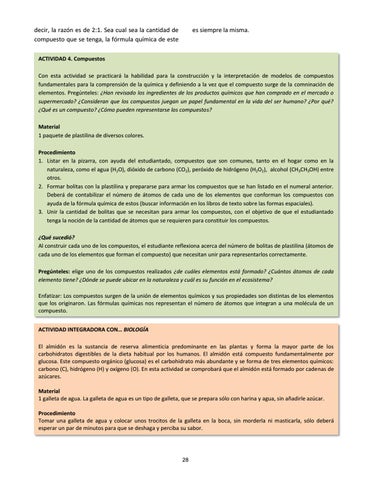 ACTIVIDAD 4. Compuestos Con esta actividad se practicará la habilidad para la construcción y la interpretación de modelos de compuestos fundamentales para la comprensión de la química y definiendo a la vez que el compuesto surge de la comninación de elementos. Pregúnteles: ¿Han revisado los ingredientes de los productos químicos que han comprado en el mercado o supermercado? ¿Consideran que los compuestos juegan un papel fundamental en la vida del ser humano? ¿Por qué? ¿Qué es un compuesto? ¿Cómo pueden representarse los compuestos? Material 1 paquete de plastilina de diversos colores. Procedimiento 1. Listar en la pizarra, con ayuda del estudiantado, compuestos que son comunes, tanto en el hogar como en la naturaleza, como el agua (H2O), dióxido de carbono (CO2), peróxido de hidrógeno (H2O2), alcohol (CH3CH3OH) entre otros. 2. Formar bolitas con la plastilina y prepararse para armar los compuestos que se han listado en el numeral anterior. Deberá de contabilizar el número de átomos de cada uno de los elementos que conforman los compuestos con ayuda de la fórmula química de estos (buscar información en los libros de texto sobre las formas espaciales). 3. Unir la cantidad de bolitas que se necesitan para armar los compuestos, con el objetivo de que el estudiantado tenga la noción de la cantidad de átomos que se requieren para constituir los compuestos. ¿Qué sucedió? Al construir cada uno de los compuestos, el estudiante reflexiona acerca del número de bolitas de plastilina (átomos de cada uno de los elementos que forman el compuesto) que necesitan unir para representarlos correctamente. Pregúnteles: elige uno de los compuestos realizados ¿de cuáles elementos está formado? ¿Cuántos átomos de cada elemento tiene? ¿Dónde se puede ubicar en la naturaleza y cuál es su función en el ecosistema? Enfatizar: Los compuestos surgen de la unión de elementos químicos y sus propiedades son distintas de los elementos que los originaron. Las fórmulas químicas nos representan el número de átomos que integran a una molécula de un compuesto. ACTIVIDAD INTEGRADORA CON… BIOLOGÍA El almidón es la sustancia de reserva alimenticia predominante en las plantas y forma la mayor parte de los carbohidratos digestibles de la dieta habitual por los humanos. El almidón está compuesto fundamentalmente por glucosa. Este compuesto orgánico (glucosa) es el carbohidrato más abundante y se forma de tres elementos químicos: carbono (C), hidrógeno (H) y oxígeno (O). En esta actividad se comprobará que el almidón está formado por cadenas de azúcares. Material 1 galleta de agua. La galleta de agua es un tipo de galleta, que se prepara sólo con harina y agua, sin añadirle azúcar. Procedimiento Tomar una galleta de agua y colocar unos trocitos de la galleta en la boca, sin morderla ni masticarla, sólo deberá esperar un par de minutos para que se deshaga y perciba su sabor.