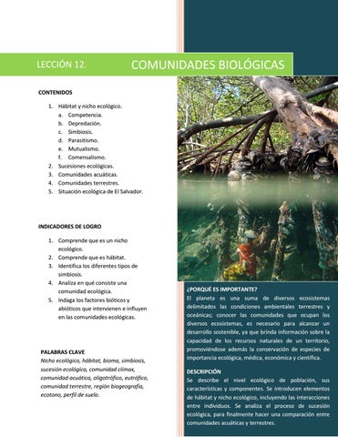 PALABRAS CLAVE Nicho ecológico, hábitat, bioma, simbiosis, sucesión ecológica, comunidad clímax, comunidad acuática, oligotrófico, eutrófico, comunidad terrestre, región biogeografía, ecotono, perfil de suelo.