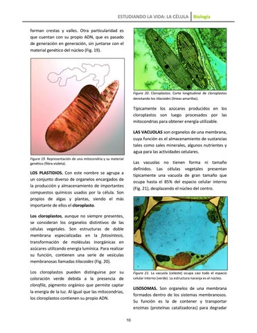 ESTUDIANDO LA VIDA: LA CÉLULA Biología forman crestas y valles. Otra particularidad es que cuentan con su propio ADN, que es pasado de generación en generación, sin juntarse con el material genético del núcleo (Fig. 19).