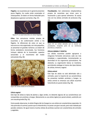 ESTUDIANDO LA VIDA: LA CÉLULA Biología Flagelos. Los eucariotas por lo general presentan pocos flagelos, los cuales están conectados al citoesqueleto. Se baten en forma helicoidal para desplazarse o generar corrientes. (Fig. 27).