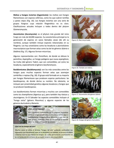 SISTEMÁTICA Y TAXONOMÍA Biología Mohos y hongos inciertos (Zygomicota): los mohos son hongos filamentosos con esporas esféricas, como los que cubren tortillas y panes viejos (Fig. 16). Los hongos inciertos son una serie de grupos fúngicos cuya relación filogenética no es clara. Clasificaciones actuales incluyen a todos dentro del phylum Glomeromycota. Ascomicetos (Ascomycota): es el phylum más grande del reino Fungi con más de 64,000 especies. Su característica principal es la generación de esporas en sacos llamados ascas (de ahí su nombre), aunque también incluye especies relacionadas en su filogenia. Los hay unicelulares como las levaduras o pluricelulares macroscópicos que forman setas como las de los géneros Xylaria o Daldinia (Fig. 17). Algunos forman micorrizas.