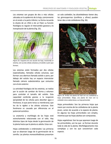 un solo cotiledón; las dicotiledóneas tienen dos; las gimnospermas (coníferas y afines) pueden tener dos o más cotiledones (Fig. 26).