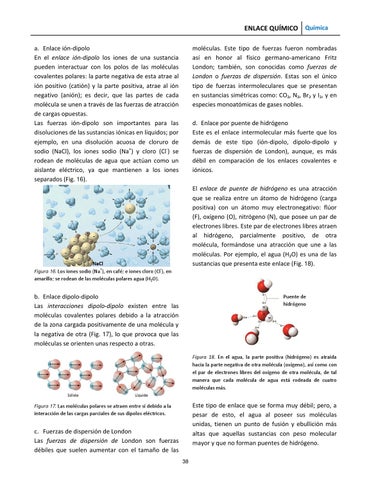 ENLACE QUÍMICO Química a. Enlace ión-dipolo En el enlace ión-dipolo los iones de una sustancia pueden interactuar con los polos de las moléculas covalentes polares: la parte negativa de esta atrae al ión positivo (catión) y la parte positiva, atrae al ión negativo (anión); es decir, que las partes de cada molécula se unen a través de las fuerzas de atracción de cargas opuestas. Las fuerzas ión-dipolo son importantes para las disoluciones de las sustancias iónicas en líquidos; por ejemplo, en una disolución acuosa de cloruro de sodio (NaCl), los iones sodio (Na+) y cloro (Cl-) se rodean de moléculas de agua que actúan como un aislante eléctrico, ya que mantienen a los iones separados (Fig. 16).