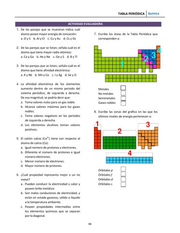 metal? a. Pueden conducir la electricidad y calor y poseen brillo metálico. b. Son malos conductores de electricidad; y están en estado gaseoso, sólido o líquido a la temperatura ambiente. c. Poseen propiedades intermedias entre los elementos químicos que se separan por la diagonal. 66