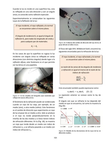 El físico del siglo XVII, Willebrord Snell, encontró los siguientes enunciados para la refracción de la luz: En los casos de que la superficie es rugosa la luz incidente con ángulo único es reflejada en varias direcciones (con distintos ángulos) dando lugar a la reflexión difusa, este fenómeno es el que permite ver las letras en una papeleta.