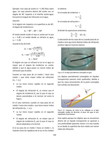 Si el ángulo con respecto a la superficie es de 40°, el ángulo de incidencia es: Al dividir las expresiones anteriores: El medio donde incide el rayo es aceite por lo que y el medio donde se refracta es agua, La desviación de los rayos de luz cuando pasa de un medio a otro que tiene distinto índice de refracción produce algunas ilusiones ópticas: