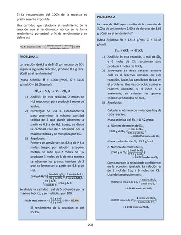 PROBLEMA 2 La masa de SbCl3 que resulta de la reacción de 3.00 g de antimonio y 2.00 g de cloro es de 3.65 g. ¿Cuál es el rendimiento?