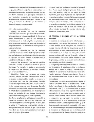4.8 PRIMERA Y SEGUNDA LEY DE LA TERMODINÁMICA En mecánica la energía se conserva si las fuerzas son conservativas y no actúan fuerzas como la fricción. En ese modelo no se incluyeron los cambios de energía interna del sistema. La primera ley de la termodinámica es una generalización de la ley de conservación de la energía que incluye los posibles cambios en la energía interna. Es una ley válida en todo el Universo y se puede aplicar a todos los tipos de procesos, permite la conexión entre el mundo macroscópico con el microscópico. La energía se puede intercambiar entre un sistema y sus alrededores de dos formas. Una es realizando trabajo por o sobre el sistema, considerando la medición de las variables macroscópicas tales como Presión, Volumen y Temperatura. La otra forma es por transferencia de calor, la que se realiza a escala microscópica Considerando un sistema termodinámico donde se produce un cambio desde un estado inicial a otro final , en el cual el sistema absorbe o libera una cantidad de calor y se realiza trabajo por o sobre el sistema. Si se mide experimentalmente la cantidad para diferentes procesos que se realicen para ir desde el estado inicial al estado final, se encuentra que su valor no cambia, a esta diferencia de se le llama cambio de energía interna del sistema. Aunque por separados y dependen de la trayectoria, la cantidad , esto es, el cambio de energía interna es independiente de la trayectoria o del proceso que se realice para ir desde el estado inicial al estado final. Por esta razón 62
