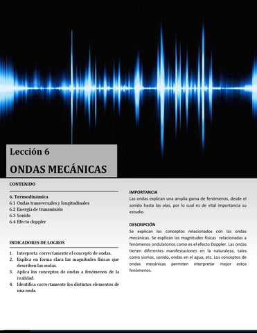 ONDAS MECÁNICAS CONTENIDO 6. Termodinámica 6.1 Ondas transversales y longitudinales 6.2 Energía de transmisión 6.3 Sonido 6.4 Efecto doppler
