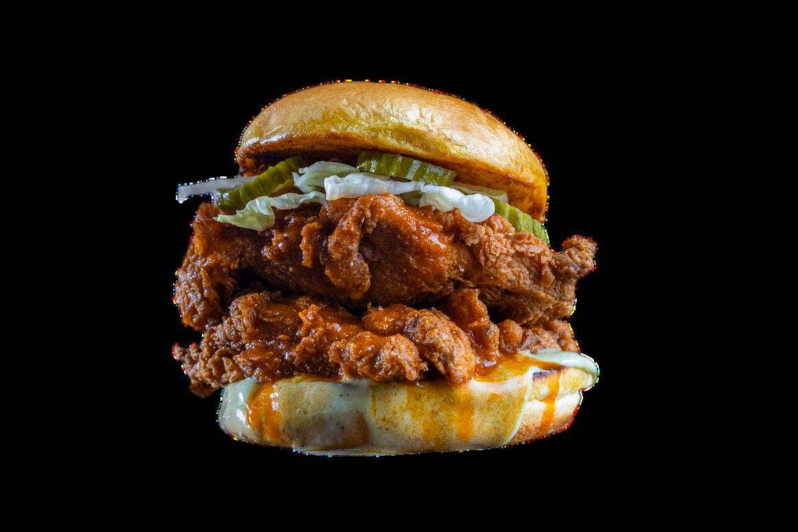 Crispy fried chicken slathered in Nashville Hot sauce, topped with tangy pickles