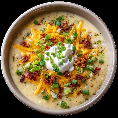 LoadedPotatoSoup LoadedPotatoSoup CREAMY AND HEARTY SERVED HOTWITH MELTY CHEESE AND CRISP CRACKERS.