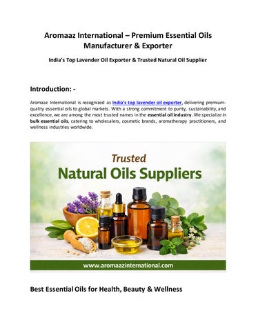 Aromaaz International is a globally recognized brand offering the best essential oils known for their purity, quality, and effectiveness. With years of expertise in sourcing and manufacturing, Aromaaz International delivers the best essential oils that meet international standards for aromatherapy, skincare, and wellness applications. Our wide collection of the best essential oils is carefully extracted from natural ingredients to preserve their authentic aroma and therapeutic properties. We are committed to providing chemical-free, sustainable, and premium-grade oils suitable for personal and commercial use. As a trusted supplier, Aromaaz International ensures consistency, affordability, and customer satisfaction. Whether you are a manufacturer, wholesaler, or wellness brand, our best essential oils help enhance your products and deliver exceptional results.