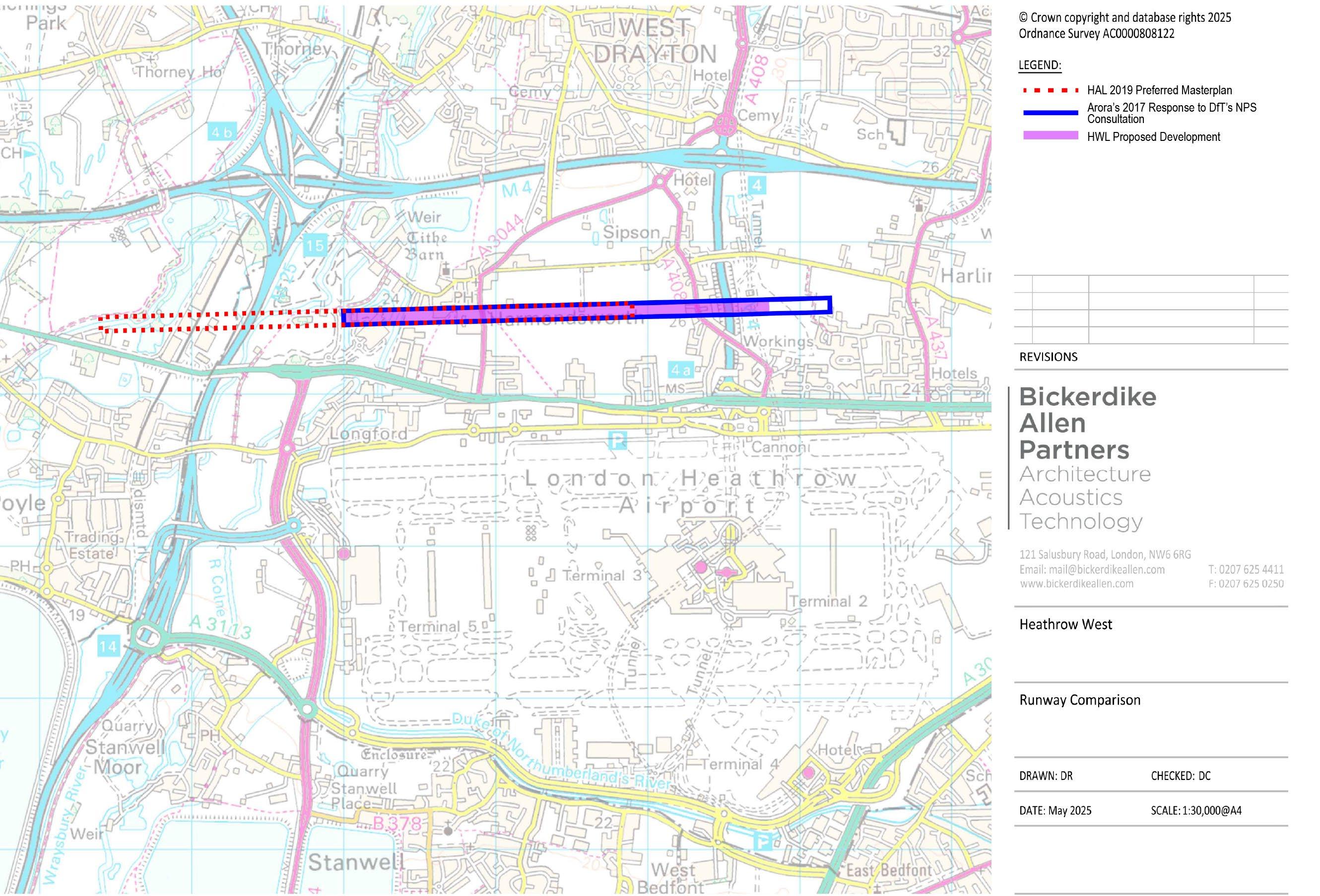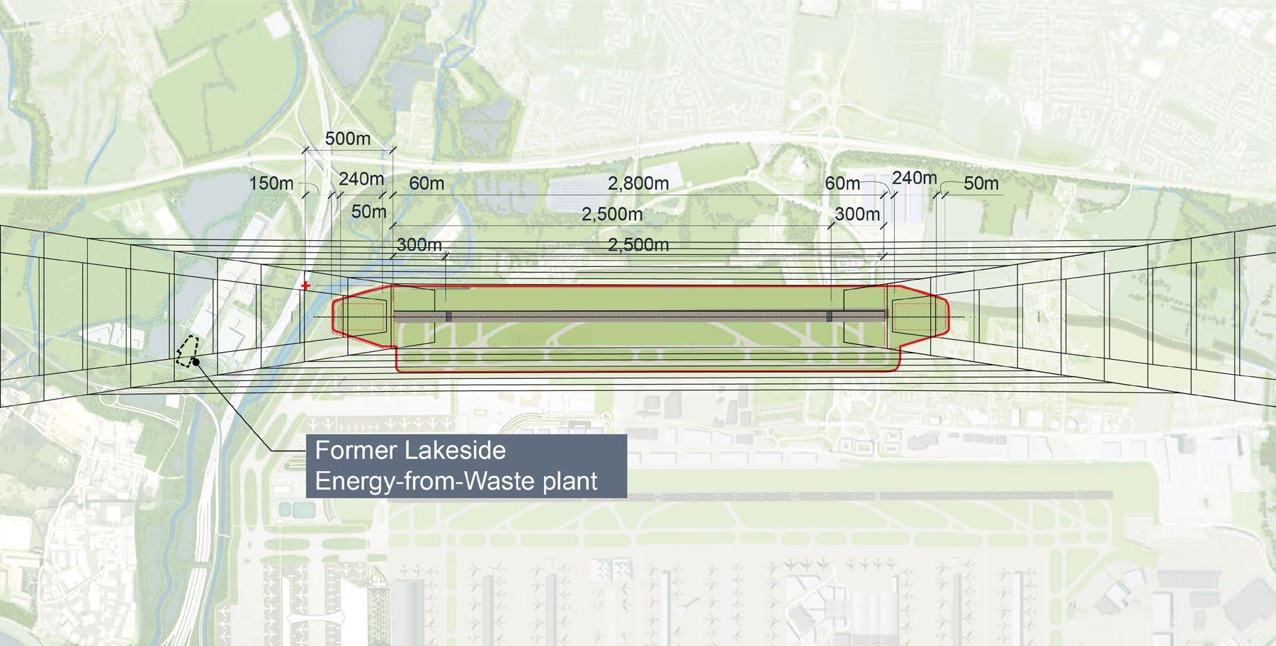 A new 2,800m runway proposed by Heathrow West Limited located northwest of Heathrow Airport forming a part of HWL’s Proposed Development.