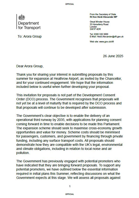 The Secretary of State for Transport’s 26 June 2025 letter to Arora Group, inviting a proposal for Heathrow Expansion