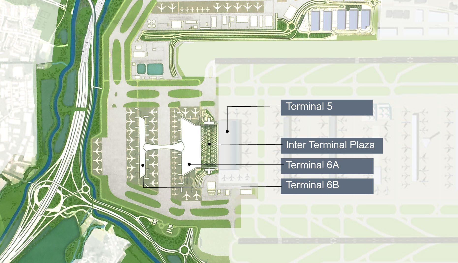 • a new Terminal 6 (T6) passenger terminal, featuring a pedestrian bridge connecting its main terminal T6A to its satellite pier T6B, an Inter-Terminal Plaza (ITP) shared with existing Terminal 5 (T5), two new hotels and a Public Transport Hub