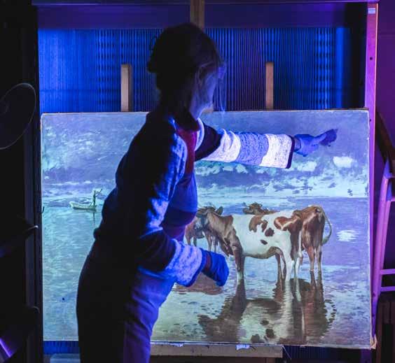 "Jeg skal vide, om der er reparationer på værket, når jeg begynder at rense i fernissen. Forskellige malingstyper behøver forskellige opløsningsmidler, og jeg skulle jo helst ikke påføre maleriet nye skader,” siger Elizabeth Baadsgaard. Er en reparation blevet grim med tiden, kan hun fjerne den. Er det derimod en del af det originale værk, skal det rettes og udbedres.