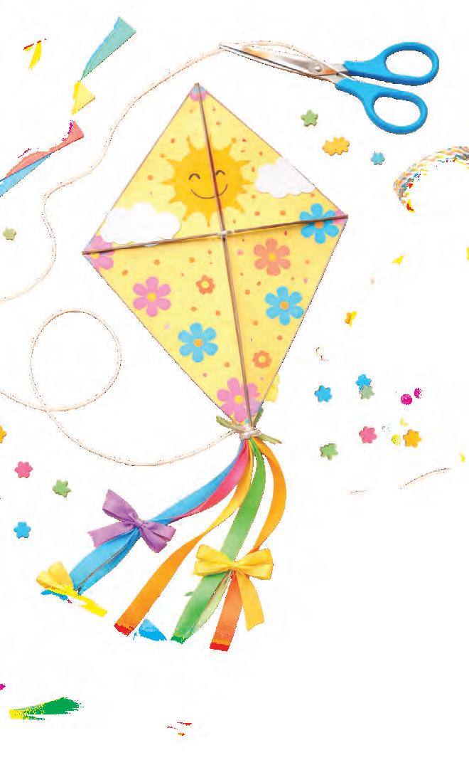 OW TO MAKE IT: ut your paper into a diamond shape ape or glue the sticks across the back in a cross shape ie string around the four corners to make the piece of string to the centre for flying ue or tape ribbons to the bottom to make a tail ecorate your kite with drawings, patterns