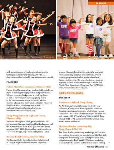 The Story Studio, Discovery Bay, Tung Chung & Mui Wo The Story Studio runs writing workshops for kids who love writing stories, and for parents who’d like their kids to improve their writing skills and explore their own, unique creativity. Each weekly, 90-minute workshop looks at both the creative and technical side of writing. The Best of Lantau 55