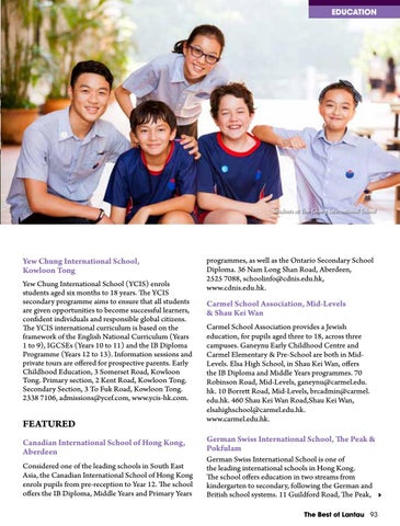 Carmel School Association, Mid-Levels & Shau Kei Wan Carmel School Association provides a Jewish education, for pupils aged three to 18, across three campuses. Ganeynu Early Childhood Centre and Carmel Elementary & Pre-School are both in MidLevels. Elsa High School, in Shau Kei Wan, offers the IB Diploma and Middle Years programmes. 70 Robinson Road, Mid-Levels, ganeynu@carmel.edu. hk. 10 Borrett Road, Mid-Levels, brcadmin@carmel. edu.hk. 460 Shau Kei Wan Road,Shau Kei Wan, elsahighschool@carmel.edu.hk. www.carmel.edu.hk.