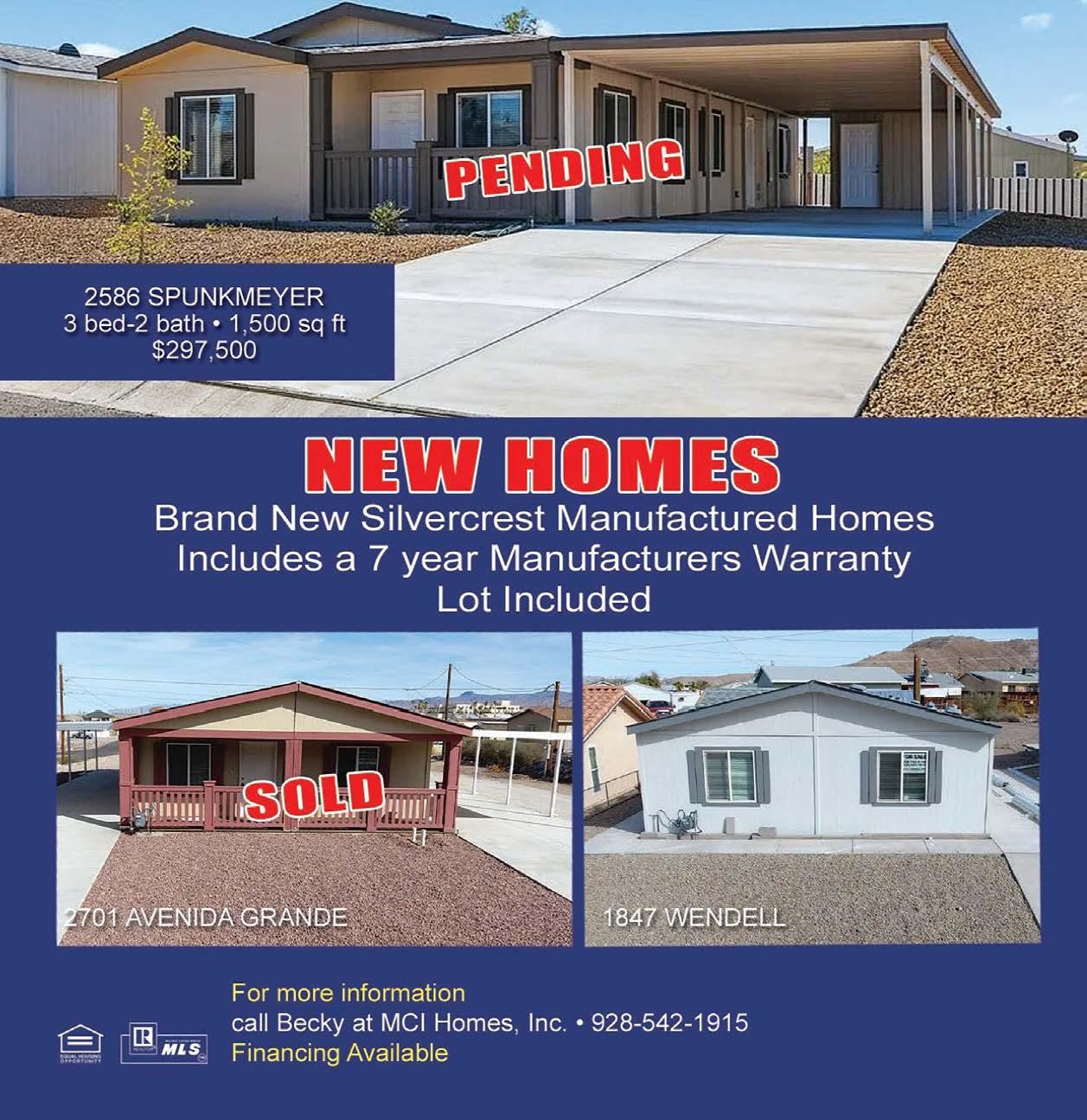 PRICE REDUCED! Cute 2 bed, 2 bath home offers 1,027 sq. ft. perfectly situated in a prime location. Covered rear patio. Fully fenced backyard with privacy & mountain views. Finished garage with laundry #025420 $211,900 1,512 sq. ft. 3 bed, 2 bath 2005 factory ordered Skyline ground set mobile home in Willow Valley with private marina access on the Colorado River. Vaulted ceiling & bay windows. Fully fenced yard. Extra lot next door