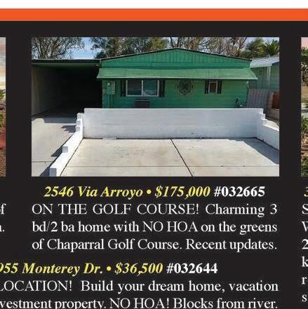 bd, 2 bath home located in the gated community of Los LagosBacks up to the 3rd tee! Granite counters in the kitchen and baths, upgraded appliances, natural gas cooking, an eat in open dining area off the kitchen. Split floor plan design has 2 tiled showers, a huge 20’x13.5’ primary suite with a skylight in the bathroom for natural light, a large walk in closet. Open views from the rear covered patio. Fully landscaped. Finished garage is extra deep (27.5’). Solar screens on all windows, custom window coverings and a water conditioning system. The hot water tank & lines are brand new. Community clubhouse, huge pool, spa, tennis courts, pickleball and more. #027189 $380,000