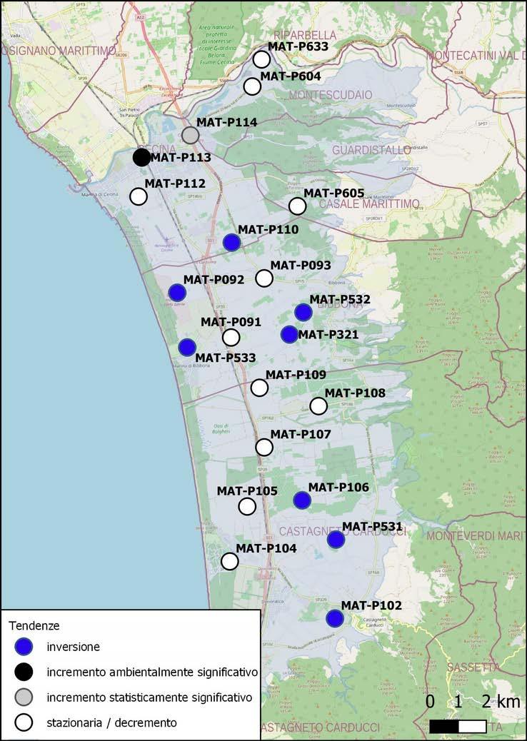 Positive inversioni dei nitrati si riscontrano in molti di questi corpi idrici nelle aree interne come Firenze 11ar011, Prato 11ar012 e falda profonda Chiana 11ar030-1 e costieri come tra Cecina e San Vincenzo 32ct010 e terrazzo di San Vincenzo 32ct021.