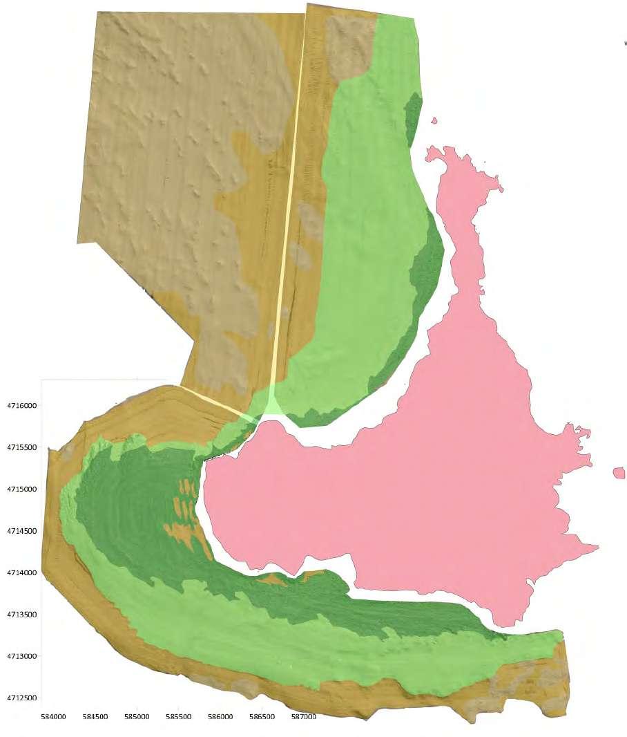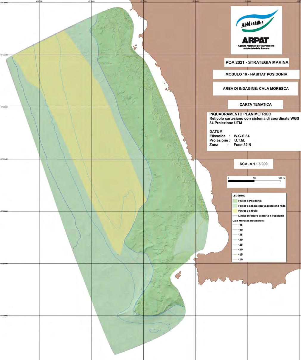 A partire dal 2020, poi, sulla base dell’aggiornamento delle schede metodologiche 2 per il Programma di monitoraggio previsto dalla Strategia Marina (D.Lgs. 190/2010), è stato deciso di individuare 3 unità di osservazione su una superficie di 3 km2 di prateria. In pratica, quindi, per ogni prateria di P. oceanica monitorata in Toscana è stata definita 1 area di 3 km2, all’interno della quale sono state individuate 3 stazioni intermedie e 3 del limite inferiore, triplicando le misure e le analisi sopra previste (Figura 4).