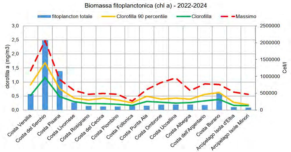 • la biomassa fitoplanctonica (vedi par. 3.1.6) risulta in stato elevato in tutti i corpi idrici ad eccezione di Costa del Serchio (buono), probabilmente, a causa degli apporti del Canale Burlamacca (emissario del Lago di Massaciuccoli);