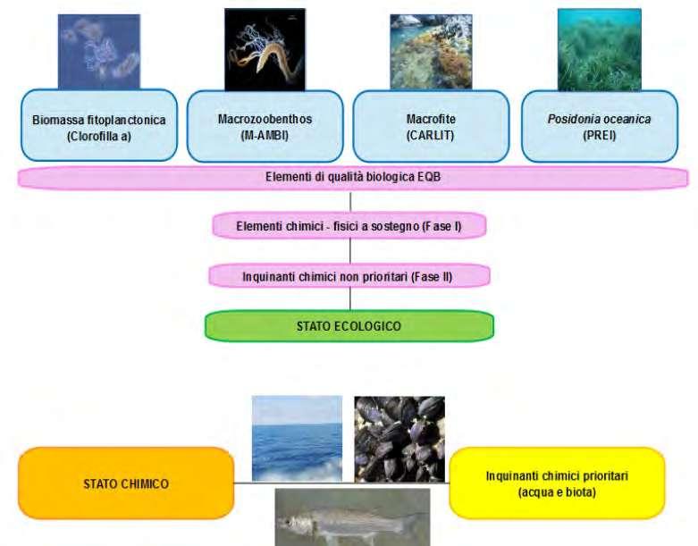 La classificazione dei corpi idrici costieri viene determinata in base allo “stato ecologico” ed allo “stato chimico” (Figura 1):