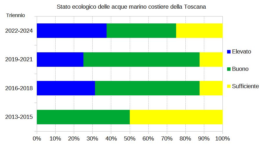 Figura 31: stato ecologico dei corpi idrici della Toscana nei trienni di monitoraggio marino dal 2013 al 2024