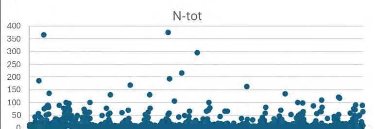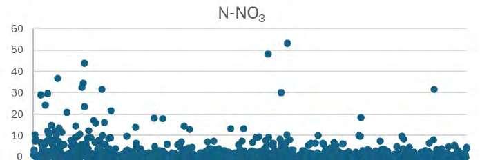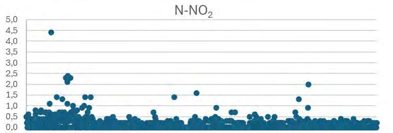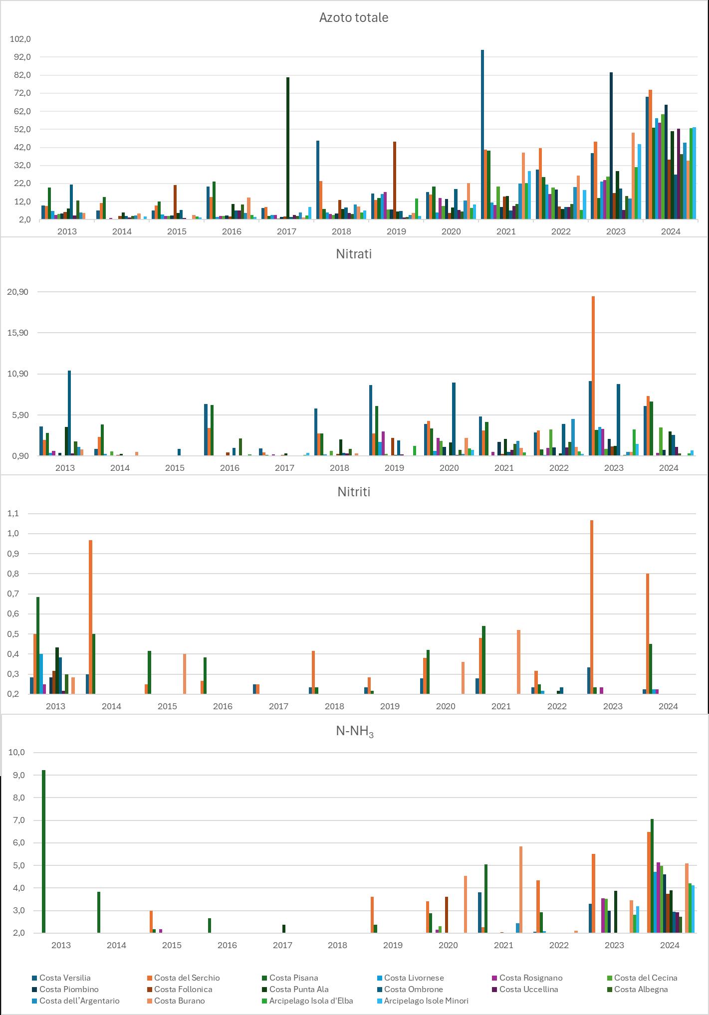Inoltre, si deve segnalare un aumento generale delle componenti azotate nelle acque costiere e, in particolare, nei corpi idrici posti a Nord tanto che, ad esempio, in Costa del Serchio si ha una tendenza positiva (test Mann-Kendall) nelle concentrazioni medie annuali per l’azoto totale, i nitrati e l’azoto ammoniacale. Questo aumento statisticamente significativo dei nutrienti ovviamente si riflette anche sull’indice trofico TRIX i cui valori nel periodo 2022-2024 risultano leggermente più alti rispetto ai trienni precedenti.