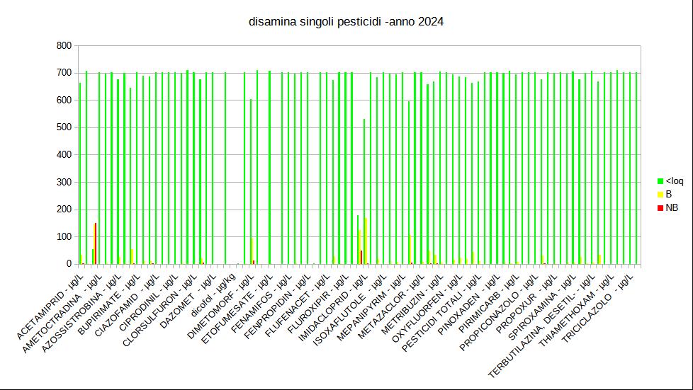 Nei grafici successivi si riporta una disamina dei singoli dati determinati nel corso del 2024 relativamente ai parametri di tab 1B, che concorrono alla definizione dello stato ecologico. Tali sostanze sono divise in due gruppi, le prioritarie e i principi attivi di fitofarmaci sono considerati a parte, anche per una migliore lettura dei grafici, considerato il numero di parametri analizzati in un anno.
