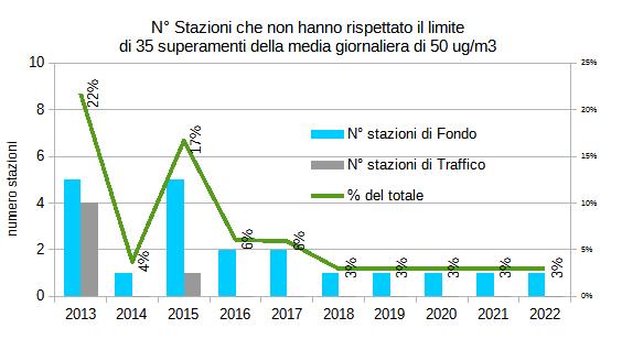 il limite relativo al numero massimo di 35 superamenti della media giornaliera di 50 µg/m3 di PM10 (allegato XI D.Lgs.155/2010 e s.m.i.), è stato superato soltanto presso una stazione urbana di fondo della zona del Valdarno Pisano e Piana Lucchese, dove la stazione LU-Capannori, ha registrato 40 superamenti: si tratta dell’unica eccezione al pieno rispetto della normativa.